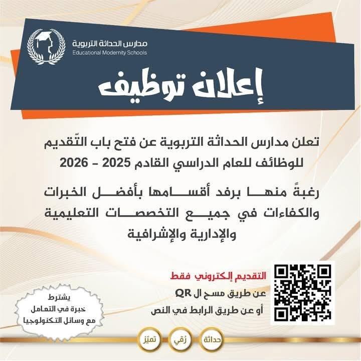 Al-Hadatha Educational Schools announces the opening of job applications for the next academic year 2025-2026, desiring