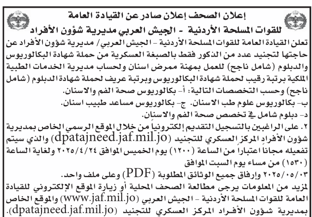 إعلان صادر عن القيادة العامة للقوات المسلحة الأردنية – الجيش العربي مديرية شؤون الأفراد