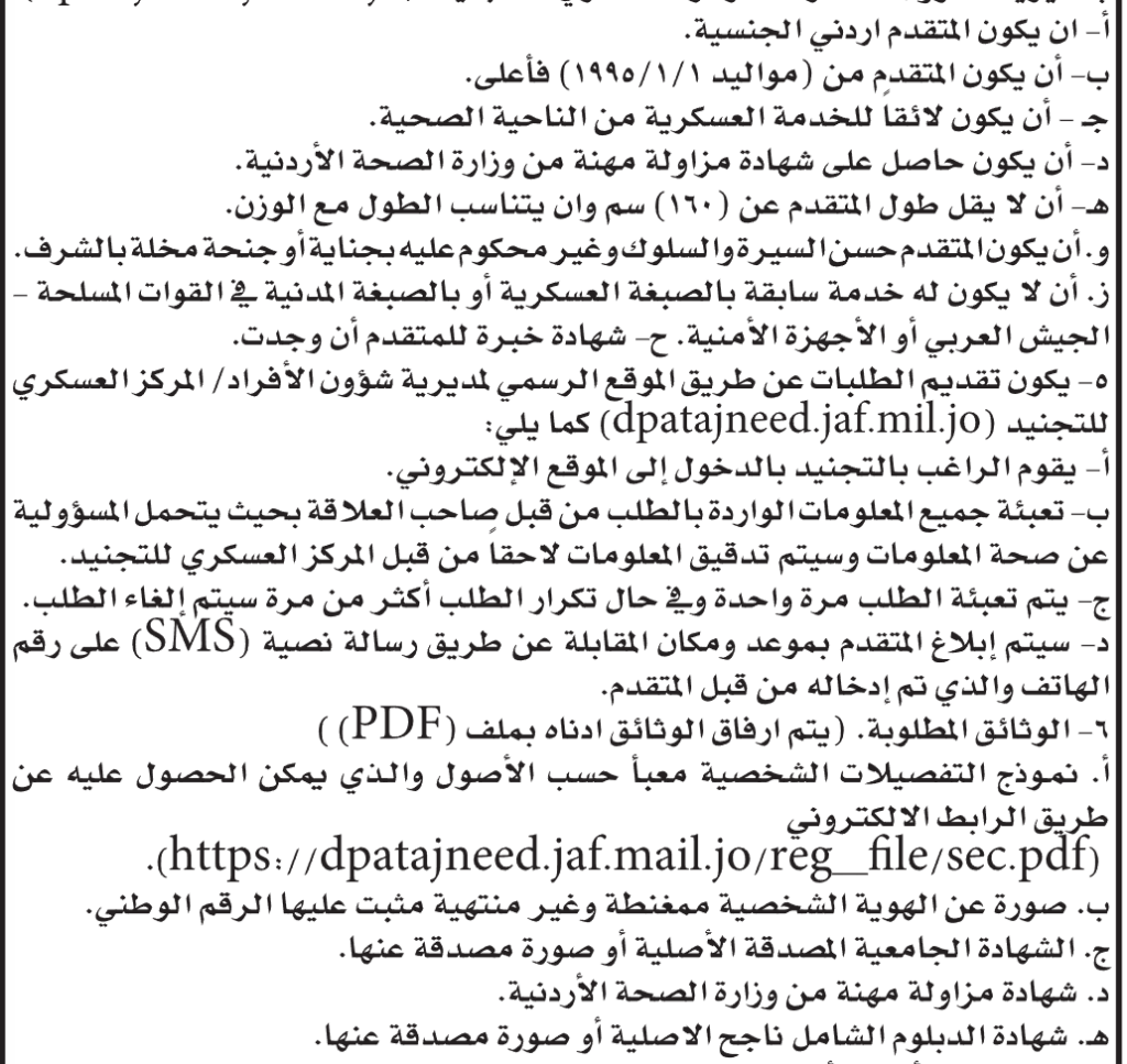 3. لمزيد من المعلومات يرجى مطالعة الصحف المحلية أو زيارة الموقع الإلكتروني للقيادة العامة للقوات المسلحة الأردنية – الجيش العربي (www.jaf.mil.jo) والموقع الخاص بمديرية شؤون الأفراد المركز .(dpatajneed.jaf.mil.jo) العسكري للتجنيد.