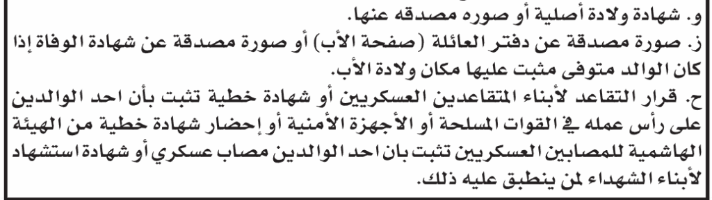 ح. قرار التقاعد لأبناء المتقاعدين العسكريين أو شهادة خطية تثبت بأن أحد الوالدين على رأس عمله في القوات المسلحة أو الأجهزة الأمنية أو إحضار شهادة خطية من الهيئة الهاشمية للمصابين العسكريين تثبت بأن أحد الوالدين مصاب عسكري أو شهادة استشهاد لأبناء الشهداء لمن ينطبق عليه ذلك.