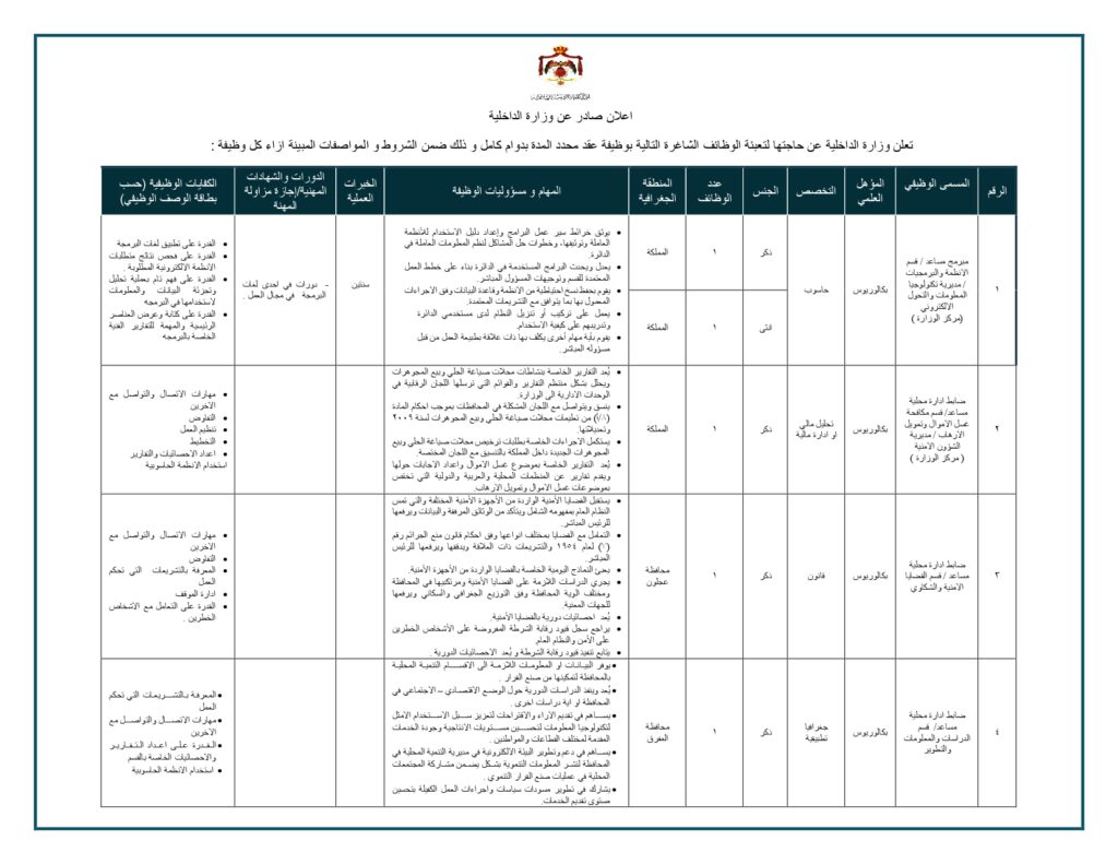 تعلن وزارة الداخلية عن حاجتها لتعبئة الوظائف الشاغرة التالية بوظيفة عقد محدد المدة بدوام كامل وذلك ضمن الشروط والمواصفات المبينة بجانب كل وظيفة.