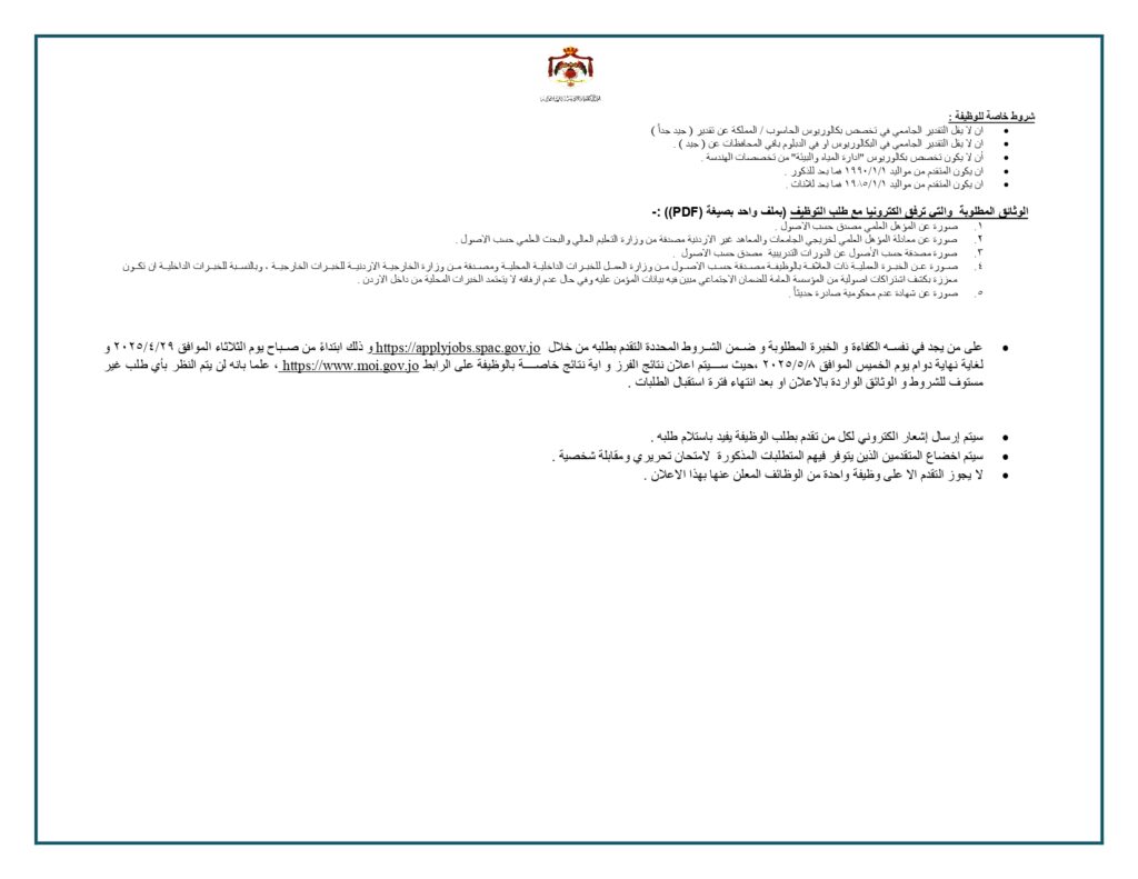 على من يجد في نفسه الكفاءة والخبرة المطلوبة وضمن الشروط المحددة التقدم بطلبه من خلال https://applyjobs.spac.gov.jo وذلك ابتداءً من صباح يوم الثلاثاء الموافق 29/4/2025 ولغاية نهاية دوام يوم الخميس الموافق 08/05/2025 ، حيث سيتم اعلان نتائج الفرز وأية نتائج خاصة بالوظيفة على الرابط https://www.moi.gov.jo ، علماً بأنه لن يتم النظر بأي طلب غير مستوف للشروط والوثائق الواردة بالإعلان أو بعد انتهاء فترة استقبال الطلبات.
