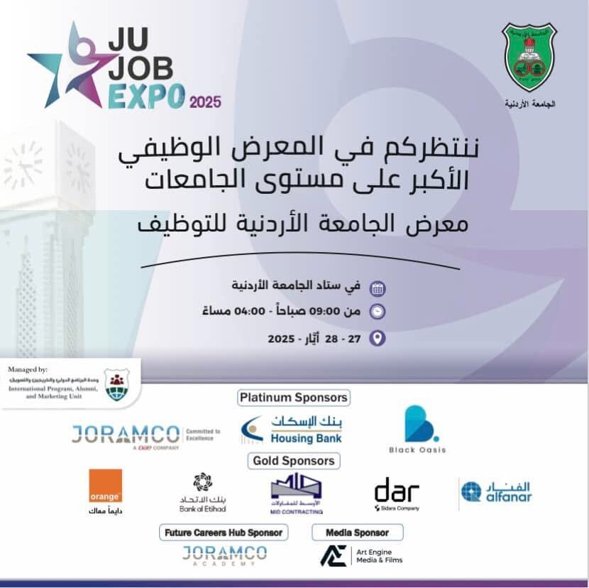 انضموا إلى المعرض الوظيفي الثالث في الجامعة الأردنية، استكشفوا فرص العمل المميزة وتواصلوا مع أرقى الشركات والمؤسسات، واحصلوا على فرصة الحصول على وظيفة تلائم طموحاتكم ومهاراتكم. لا تفوتوا هذه الفرصة !
