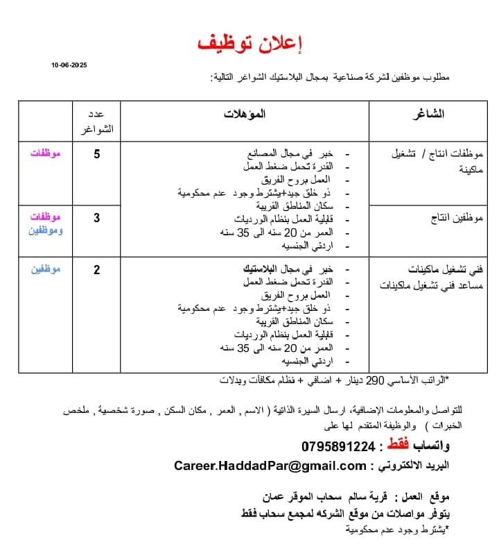 مطلوب موظفين لشركة صناعية بمجال البلاستيك بسحاب: