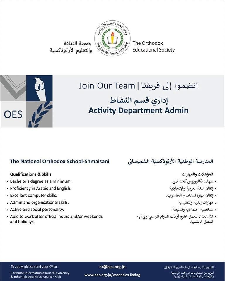 تسعى جمعية الثقافة والتعليم الأرثوذكسيّة لتوظيف إداري قسم النشاط في المدرسة الوطنيّة الأرثوذكسيّة-الشميساني.