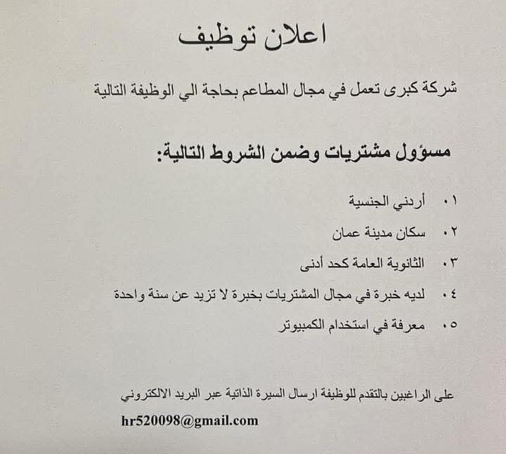مطلوب مسؤول مشتريات للعمل لدى شركة كبرى تعمل في مجال المطاعم