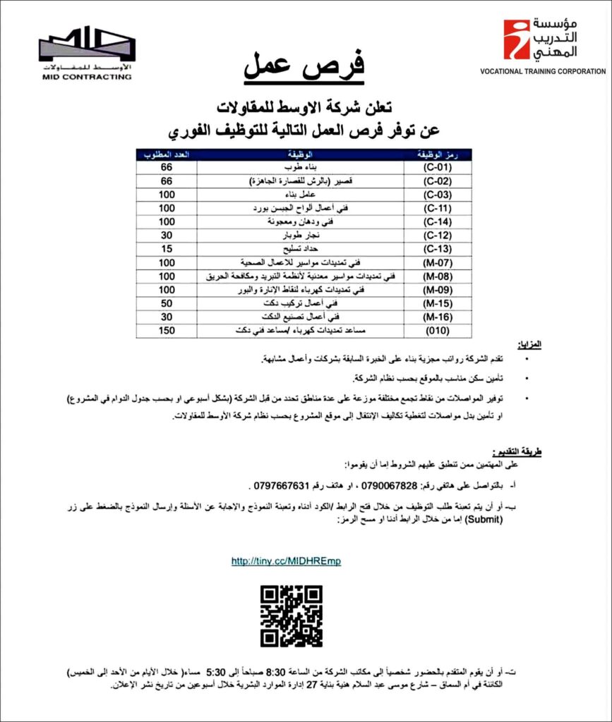 تعلن وحدة تشغيل الخريجين في مؤسسة التدريب المهني وبالتعاون مع شركة الأوسط للمقاولات عن توفر الشواغر التالية من خريجي معاهد مؤسسة التدريب المهني