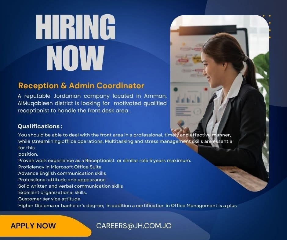 مطلوب منسق إداري واستقبال للعمل لدى إحدى الشركات